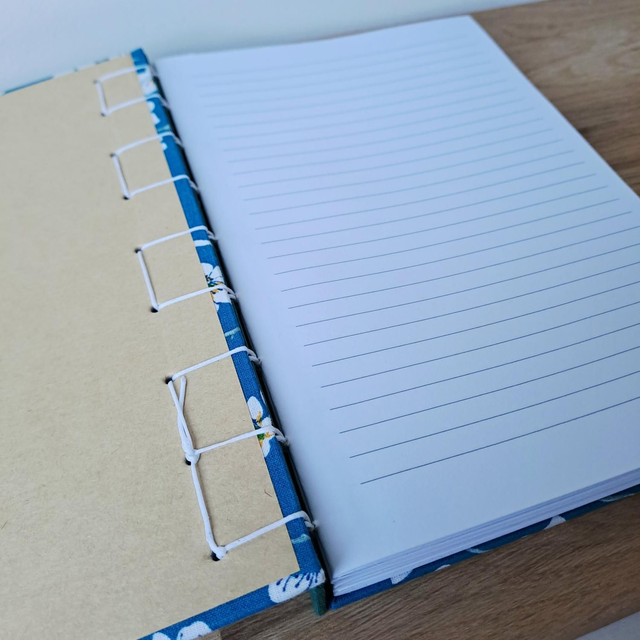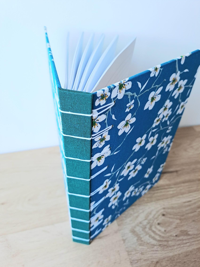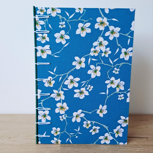 🌱 Couverture : rigide, tissu coton fleurs de cerisier blanches sur fond bleu et toile de reliure verte pour le dos
