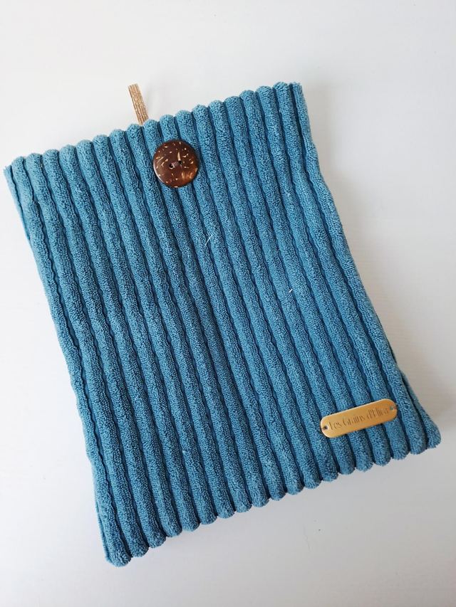 Velours côtelé couleur bleue et coton fleuri bleu pour la doublure. Fermeture par un bouton et élastique doré.