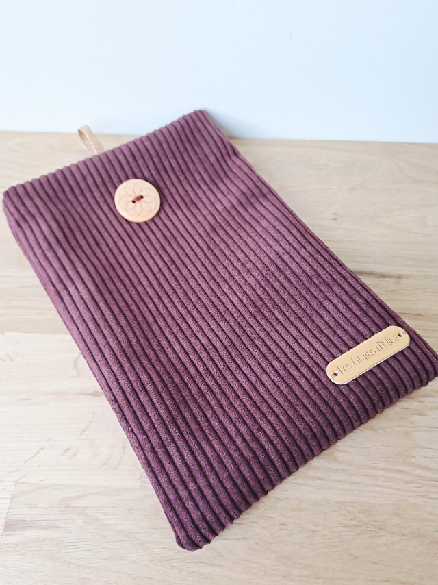 Velours côtelé prune à l'extérieur et doublure en cotonouate. Fermeture par un bouton et élastique doré.